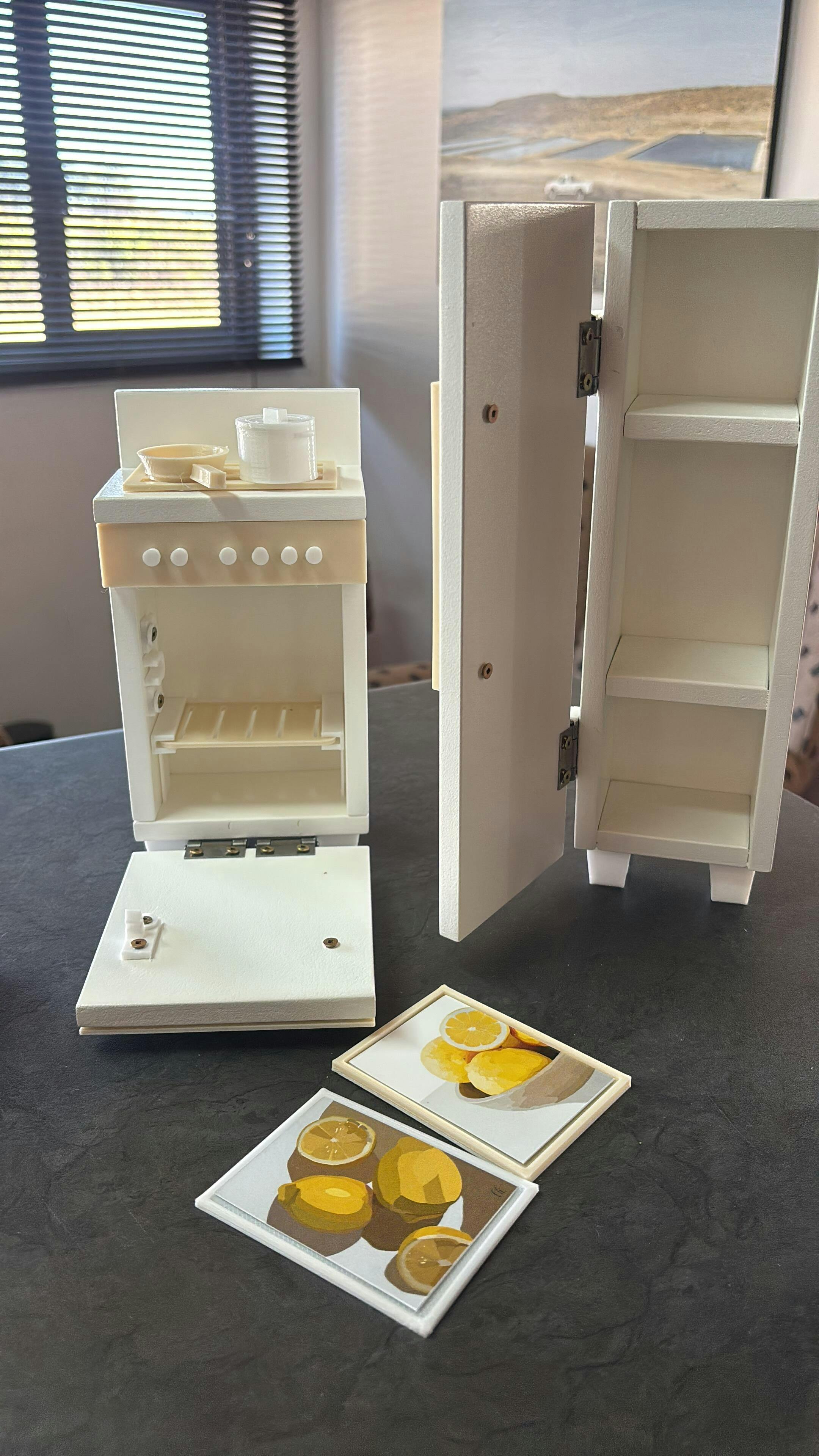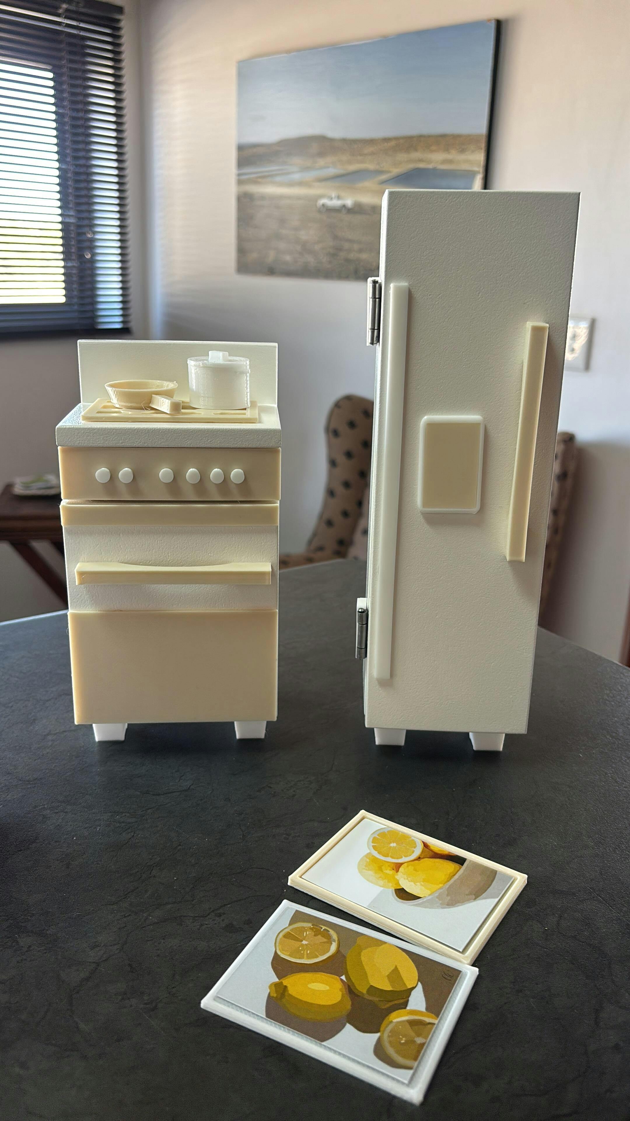 The set features a wooden stove with a lift-up door and drying rack inside, topped with 3D-printed stove plates, and a tall fridge that doubles as a cupboard with shelving – both designed to open and close for interactive play. The kitchen is complete with adorable 3D-printed décor: a pot, pan, four coffee cups, four large plates, four small plates, and four bowls, making every mealtime a story waiting to unfold.