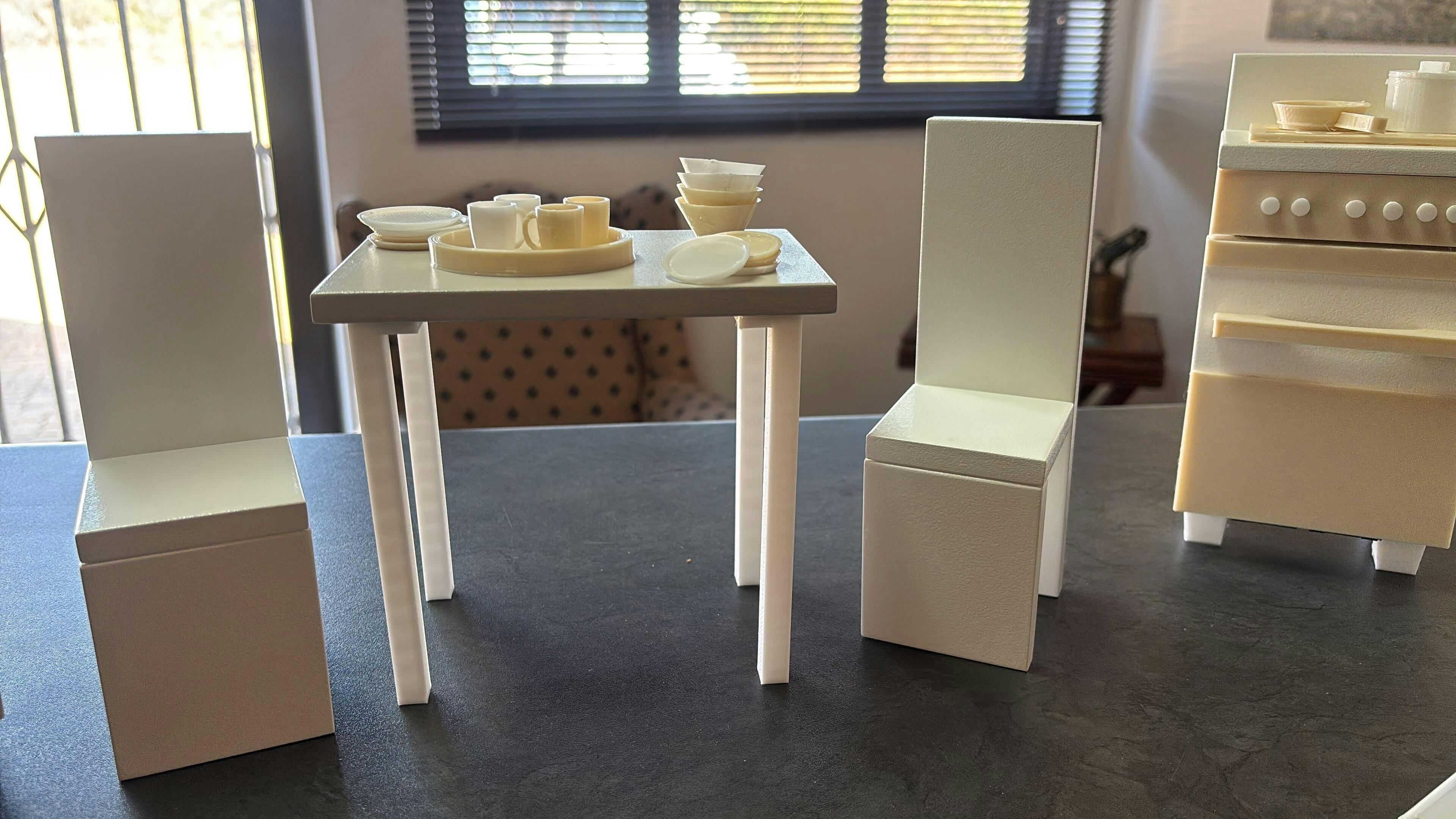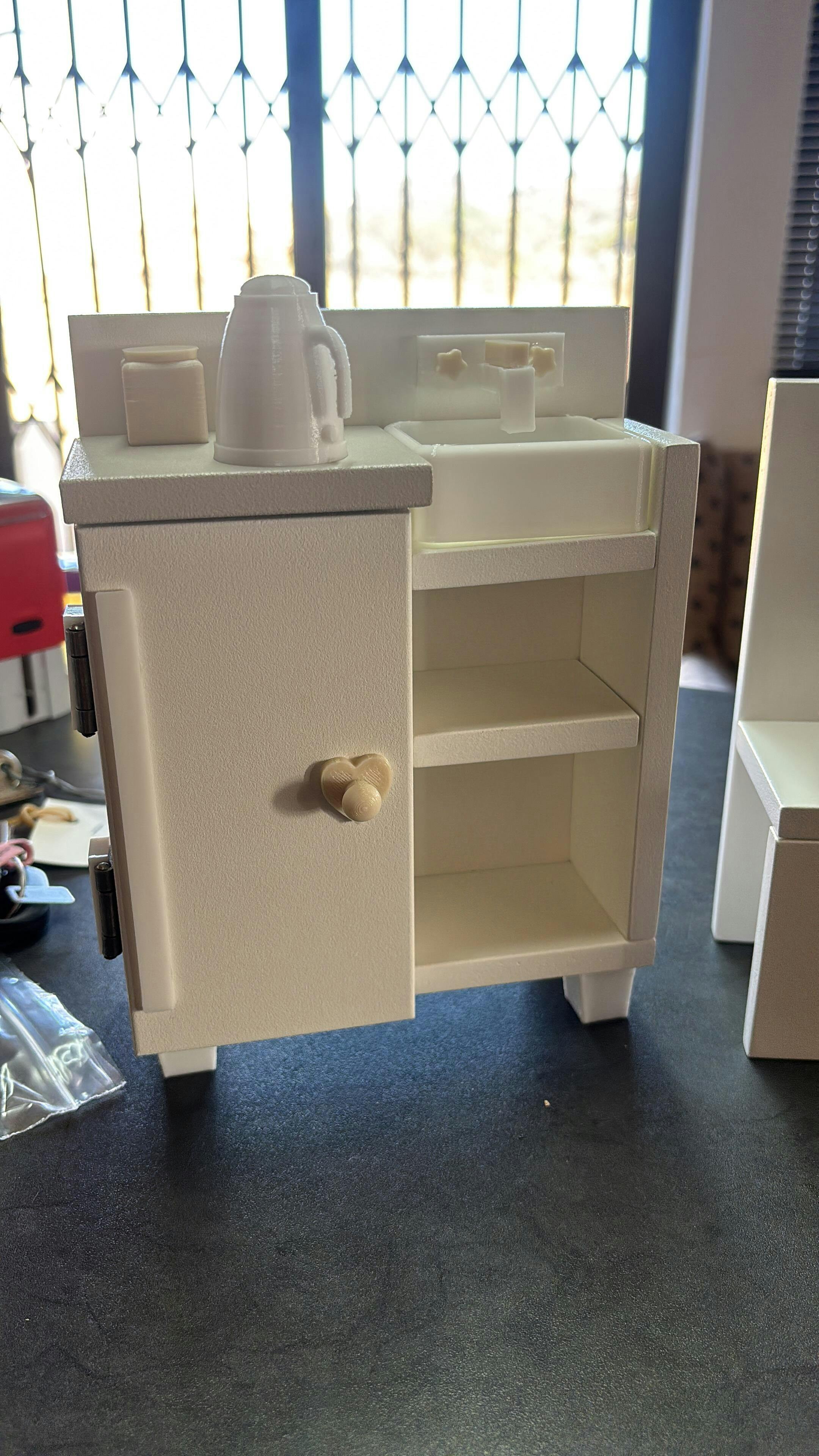 The set features a wooden basin unit with a side cupboard that opens for interactive play, complete with a 3D-printed basin and taps. A matching wooden table and two chairs provide the perfect spot for tea and treats. The 3D-printed décor adds character: a kettle, serving tray, and two lidded pots for tea or sugar, along with two hanging picture frames to brighten the walls.